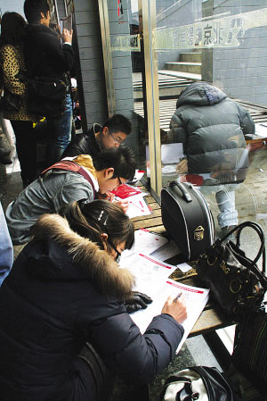 由于外地考生多,不少來報(bào)名的考生都是拖著行李直奔考場(chǎng),所以一些賓館也來到學(xué)院門口吆喝。附近煎餅攤兒的老板也樂開了花,平時(shí)一天二三百元的買賣一下子翻番。記者 王瑜明