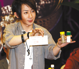 隨后,劉謙開(kāi)始為現(xiàn)場(chǎng)的媒體記者表演了一個(gè)小魔術(shù),只見(jiàn)他拿出了鹽與胡椒粉,將其混在一起,并脫掉了自己手上所有的戒指,把袖子也卷了起來(lái),在瞬時(shí)把鹽和胡椒粉分開(kāi)了。正當(dāng)大家驚呼劉謙水平高時(shí),劉謙突然自己給這個(gè)魔術(shù)解密!斑@個(gè)魔術(shù)其實(shí)已經(jīng)流傳了100多年了,這個(gè)胡椒粉其實(shí)是鐵砂,我手中藏了一塊磁鐵,只要用磁鐵一吸,鐵砂就從鹽中分離出來(lái)了。不過(guò),我在5月8日首演時(shí),將會(huì)把真正的混在一起的鹽與胡椒粉在10秒之內(nèi)分開(kāi),這才是我最新的魔術(shù)。”