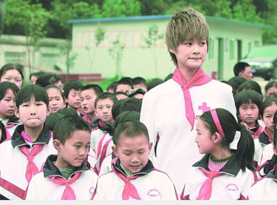 昨日下午,李宇春來(lái)到都江堰向峨鄉(xiāng)海虹小學(xué),在這里,戴上紅領(lǐng)巾的她和小學(xué)生們一起,手牽手面對(duì)鏡頭。剛開(kāi)始春春牽著小朋友的手還有點(diǎn)不自在,她坦言:“和小朋友在一起我有點(diǎn)緊張,因?yàn)閯傞_(kāi)始不太熟悉,可能有點(diǎn)拘謹(jǐn)!北M管一直活躍在舞臺(tái),和影視劇并沒(méi)有太多接觸,只是一些客串演出,但春春面對(duì)鏡頭卻顯得非常鎮(zhèn)定,臺(tái)詞功夫也十分了得。