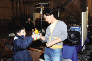 現(xiàn)場(chǎng)有一位“乘機(jī)潛入”的小歌迷,慕名來(lái)看偶像的演出。陳奕迅是娛樂(lè)圈中公認(rèn)的好父親,在家里對(duì)5歲的女兒寵愛有加,在外與別的小孩也能打成一片。在廣告拍攝過(guò)程中,陳奕迅突然走到這個(gè)小歌迷身邊,拿起手中的飲料和小歌迷碰杯,并與他一起合影,一大一小倆“頑童”的溫馨場(chǎng)面令在場(chǎng)人動(dòng)容不已!痿斘撵o