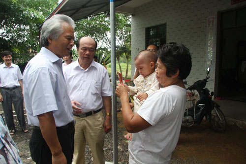 隨后,吳士存一行驅(qū)車前往該辦對口聯(lián)系的海口石山鎮(zhèn)北鋪村進行走訪慰問。在聽取了該村的村情和災(zāi)情介紹后,吳士存對該村防汛救災(zāi)取得的成效表示了高度贊賞,并指出目前關(guān)鍵任務(wù)是,抓好農(nóng)作物補救、進水房屋安全、低保困難群眾救助等工作。針對該村的發(fā)展情況,吳士存特別指出,北鋪村瀕臨?谥行膮^(qū),交通較便利,特色經(jīng)濟作物優(yōu)勢明顯,休閑農(nóng)業(yè)與旅游資源發(fā)展?jié)摿Υ。吳士存強調(diào),村委干部要明確和理清發(fā)展思路,想方設(shè)法幫助群眾發(fā)展生產(chǎn),增加收入,提高生活水平;要加大農(nóng)村衛(wèi)生環(huán)境整治,設(shè)立垃圾處理點,使村容村貌煥然一新;要設(shè)計富有海南本土特色、既實用又美觀的民居建筑,在全省形成示范和帶動作用;要將休閑旅游與農(nóng)業(yè)有機的結(jié)合起來,開發(fā)與保護本村的特色旅游資源。