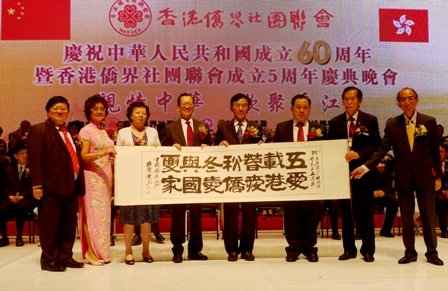 中新網(wǎng)9月29日電 9月24日晚,香港僑界社團(tuán)聯(lián)會(huì)在香港伊利沙白體育館舉辦慶祝中華人民共和國(guó)成立60周年暨香港僑界社團(tuán)聯(lián)會(huì)成立5周年慶典,香港特區(qū)行政長(zhǎng)官曾蔭權(quán)、中央政府駐港聯(lián)絡(luò)辦主任彭清華、副主任黎桂康、外交部駐港特派員公署特派員呂新華、全國(guó)政協(xié)港澳臺(tái)僑委員會(huì)副主任林兆樞、國(guó)務(wù)院僑辦副主任許又聲、中國(guó)僑聯(lián)副主席王永樂以及香港各界僑胞近3000人出席了慶典。