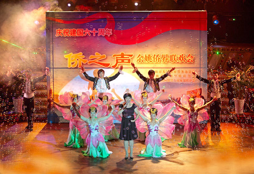 聯(lián)歡會上,廣大僑界人士除了分享這份收獲的喜悅,還共享了一場精彩的演出,以自演自唱、載歌載舞的形式來祝賀佳節(jié),共迎國慶。全國明星僑資企業(yè)長城精工的員工們懷揣著火紅的激情,以奔放的舞蹈表演《紅旗頌》掀開了整場演出的序幕,也展現(xiàn)了僑資企業(yè)的文化特質;曾亮相CCTV神州大舞臺,并獲得了全省一等獎的留學人員許云山家庭,表演的二胡獨奏《賽馬》、武術表演《梅花刀》,展示了留學人員家庭多才多藝的特色以及對祖國傳統(tǒng)文化的熱愛與傳承;小品《真情無價》生動地講述了僑眷帶頭幫助政府做好房屋拆遷動員工作的平凡故事,平凡中閃爍著僑界群眾識大體、顧大局的優(yōu)良品格;曾多次獲得國家、省級國標舞大賽獎項的僑聯(lián)委員袁建平夫婦,以曼妙的舞姿,將節(jié)日展現(xiàn)地歡快而又美麗;歸國留學創(chuàng)業(yè)人員龔碧君演唱的《今天是你的生日,我的祖國》,表達了對偉大祖國美好的祝!始姵实奈乃嚤硌,謳歌了偉大祖國60年的輝煌歷程,抒發(fā)了廣大歸僑僑眷和留學人員家屬熱愛中國共產(chǎn)黨、熱愛社會主義祖國的真切情意,褒揚了姚籍海外僑胞愛國愛鄉(xiāng)造福故里的可貴品德,展示了僑界昂揚的精神風貌和不俗的藝術才能。