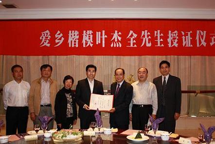 為表彰葉杰全先生重教興學(xué)、無償捐贈的義舉,2007年10月,浙江省人民政府授予葉杰全“愛鄉(xiāng)楷!睒s譽稱號。(浙江僑辦 左新元)