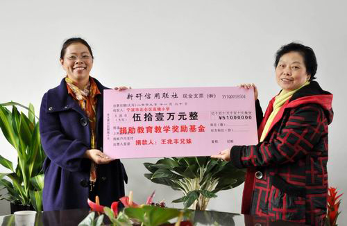 中新網(wǎng)12月3日電 據(jù)浙江僑聯(lián)網(wǎng)消息,11月30日上午,已故浙江省北侖籍港胞王兆豐先生的大兒媳唐秀娟女士代表王氏家族把祖屋拆遷的賠償款51萬元親手交給了新碶街道高塘小學(xué)校長(zhǎng)唐亞云的手中,用于設(shè)立“王兆豐兄妹教育教學(xué)獎(jiǎng)勵(lì)基金”。至此,這件長(zhǎng)達(dá)10余年的捐贈(zèng)事宜終于畫上了圓滿的句號(hào)。寧波市北侖區(qū)教育局局長(zhǎng)胡小偉、新碶街道辦事處主任徐孟杰、區(qū)僑辦副主任姚慧貞、新碶街道黨工委委員林雪鳳出席基金成立儀式。新碶街道辦事處副主任李國東主持儀式