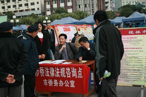 12月5日上午,桂林市在中心廣場(chǎng)組織開展“五五”普法宣傳活動(dòng)。桂林市僑辦在中心廣場(chǎng)以設(shè)置咨詢臺(tái)、擺放宣傳版報(bào)、發(fā)放宣傳資料等形式宣傳僑法,市民紛紛帶著疑惑前來咨詢、了解涉僑法規(guī)。10時(shí)30分左右,一位陳姓先生問:“我兒子自費(fèi)到美國留學(xué)后在美國打工已5年算不算華僑?”桂林市僑辦工作人員告訴他:“中國公民雖未取得住在國長期或永久居留權(quán),但已取得住在國連續(xù)5年以上(含5年)合法居留權(quán)資格,5年內(nèi)在住在國累計(jì)居留不少于30個(gè)月,視為華僑。另一種情況,中國公民出國留學(xué)(包括公派和自費(fèi))在外學(xué)習(xí)期間,或因公務(wù)出國(包括外派勞務(wù)人員)在外工作期間,均不視為華僑。還有什么疑問嗎?”隨后,還遞上一份《關(guān)于界定華僑外籍華人歸僑僑眷身份的規(guī)定》和《中華人民共和國歸僑僑眷權(quán)益保護(hù)法》,“嗯,沒有了,謝謝!”這位先生高興地說,然后接過送上來的材料。