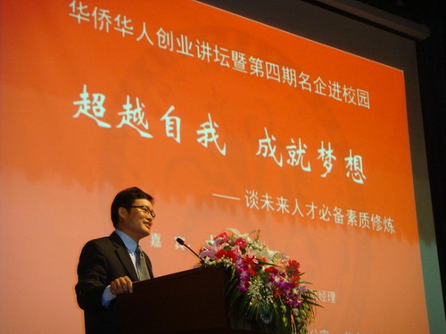 中新網(wǎng)12月30日電 據(jù)上海市僑辦消息,近日,由上海市僑辦與華東理工大學共同主辦的“華僑華人創(chuàng)業(yè)講壇”第三講在華東理工大學逸夫樓舉行。本次講壇特邀英特爾公司中國執(zhí)行董事、總經(jīng)理戈峻博士作主題為《超越自我,成就夢想――談未來人才必備素質修煉》的精彩報告,并與華東理工大學師生互動交流。