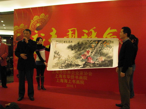 朱鵬高向上海市僑界企業(yè)家協(xié)會贈送書、畫各一幅,并為團拜會活動提供獎品的10位企業(yè)家贈送了珍貴禮品。團拜會節(jié)日氣氛濃烈,期間進行了精彩的文藝演出及抽獎活動。