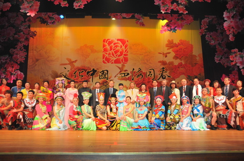 演出開始之前,在劇場外廳還展出了《中華民族全家!穲D片展,國僑辦副主任趙陽和張利民大使為圖片展揭幕剪彩。參展的百余幅照片制作精良、集中展示了中國56個民族的生活習(xí)俗、服裝服飾、文化特點(diǎn)、周邊地貌等,吸引了眾多觀眾駐足觀看。