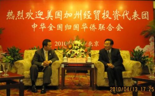 中新網(wǎng)4月14日電 據(jù)中國(guó)僑聯(lián)網(wǎng)站消息,4月13日,中國(guó)僑聯(lián)副主席王永樂在華僑大廈會(huì)見了以美國(guó)加州圣蓋博市市長(zhǎng)黃裕民為團(tuán)長(zhǎng)的加州經(jīng)貿(mào)及地產(chǎn)投資代表團(tuán)一行。