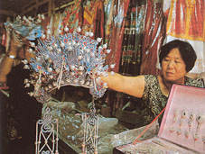 丁愛華老師是久春的?椭,每次來都是為她和票友朋友們自己組織的業(yè)余劇團采購行頭,這次她打算買幾個釵頭,再買一頂鳳冠。一看劉大媽拿出來的兩頂鳳冠,丁老師就有點拿不定主意了,兩頂鳳冠一樣漂亮,一樣華麗,但是造型風格又略有不同,比來比去,不一會兒就挑花了眼。