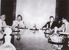 中美大使級會談期間,中方大使王炳南(左二)中方代表林平(左一)與美國大使尤·阿約翰遜在波蘭談判桌前。 |