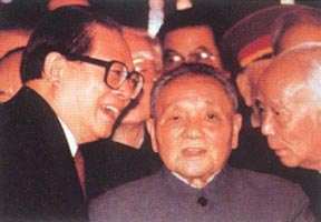 1992年10月19日,鄧小平(中)在人民大會(huì)堂與出席中共十四大的代表見面。 |