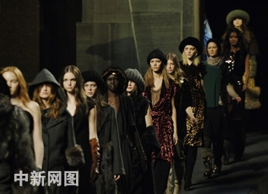2006年2月6日,紐約時裝周,模特在展示Marc Jacobs設(shè)計的新款秋裝。華麗的細節(jié)使Marc Jacobs的作品總能奪目而不夸張。時尚的風(fēng)向已經(jīng)從對奢華永無止境的追求變成了現(xiàn)在的簡單低調(diào)。設(shè)計師不再大面積使用皮草,而是將其作為點綴,使時裝展現(xiàn)出低調(diào)的奢華。