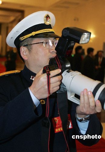 3月10日上午,十一屆全國人大一次會議在北京人民大會堂舉行第三次全體會議,精通攝影的全國人大代表、新晉海軍少將汪玉為出席會議的解放軍代表團(tuán)拍照。汪將軍系海軍裝備研究院某研究所副所長兼總工程師。中新社發(fā) 任晨鳴 攝