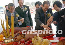 九廣鐵路公司落馬洲支線動(dòng)土儀式一月九日在香港落馬洲舉行,該支線全長(zhǎng)7.4公里,由上水站向西北伸延經(jīng)古洞、洲頭至落馬洲車站 。圖為眾官員在儀式上拜神。錢興強(qiáng) 攝