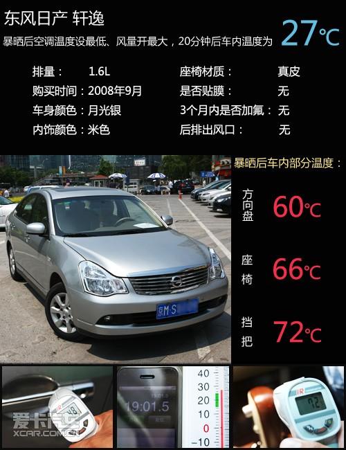 軒逸空調(diào)運(yùn)行時發(fā)動機(jī)十分乖巧,車內(nèi)除了因測試需要調(diào)到最大的風(fēng)機(jī)聲之外,其他噪音被控制得很小,對得起舒適宜家的公眾形象?照{(diào)20分鐘的賣力工作讓車內(nèi)下降了30多度,對于08年購買的軒逸來說表現(xiàn)可圈可點(diǎn)。