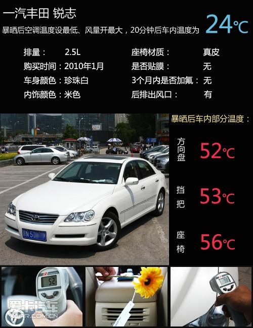 這臺今年1月份提的銳志空調(diào)涼得很快,運(yùn)行時發(fā)動機(jī)發(fā)出的噪音很低,真想坐在里面不出來。珍珠白車漆要比黑色車溫度低很多,總體來說表現(xiàn)不錯。