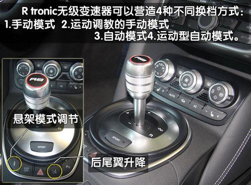 作為這臺(tái)發(fā)動(dòng)機(jī)的動(dòng)力輸出,奧迪R8可以選配“R tronic無級(jí)變速器”,或手動(dòng)6速變速器,不過試駕的車輛均為R tronic無級(jí)變速器。這臺(tái)R tronic無級(jí)變速器的優(yōu)勢(shì)在于可以營造4中不同的換檔方式即:1.純手動(dòng)模式2.運(yùn)動(dòng)調(diào)教的手動(dòng)模式3.純自動(dòng)模式4.運(yùn)動(dòng)型自動(dòng)模式。利用變速器的模仿依然能夠在手動(dòng)狀態(tài)下提供6個(gè)前進(jìn)檔位的傳動(dòng)比。