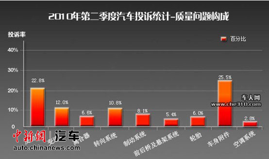 報(bào)告顯示,投訴統(tǒng)計(jì)的具體比例為:發(fā)動(dòng)機(jī)占22.8%;變速器占12.0%;離合器占6.6%;轉(zhuǎn)向系統(tǒng)占10.8%;制動(dòng)系統(tǒng)占8.1%;前后橋及懸架系統(tǒng)占5.4%;輪胎6.0%;車身附件及電氣占25.5%;空調(diào)系統(tǒng)2.8%。