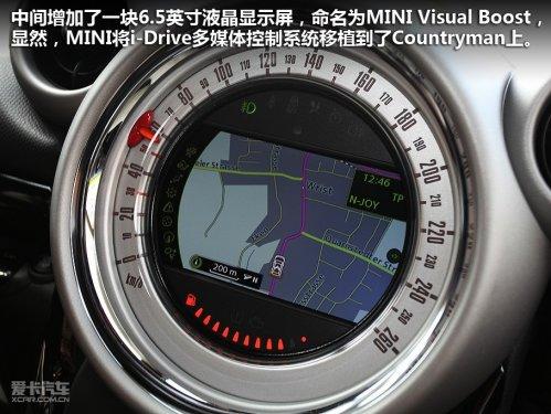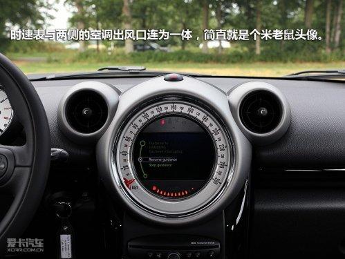 不用想,中控臺上最大的那個時速表肯定會成為視覺焦點,原因之一是時速表與兩側(cè)的空調(diào)出風(fēng)口連為一體,簡直就是個米老鼠頭像,可愛至極。原因之二是這個時速表中間增加了一塊6.5英寸液晶顯示屏,顯然,MINI將東家的i-Drive多媒體控制系統(tǒng)移植到了Countryman上,命名為MINIVisual Boost,只是沒有寶馬上那個顯眼的控制旋鈕,在MINI上這個旋鈕被放在了換擋底座的后方,使用上還算順手,只是造型比較簡化,但同樣擁有兩個直觀的快捷鍵。