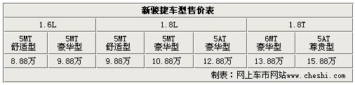 新駿捷各車型售價分別為,1.6舒適型8.88萬、1.6豪華型9.88萬、1.8舒適型9.88萬、1.8豪華型10.88萬、1.8自動豪華型12.88萬、1.8T6MT豪華型13.88萬以及1.8T5AT尊貴型15.88萬。據(jù)華晨汽車經(jīng)銷商處銷售人員介紹已經(jīng)開始接受客戶預(yù)定,展車已經(jīng)到店,有購買意向的消費者可以到店賞車。