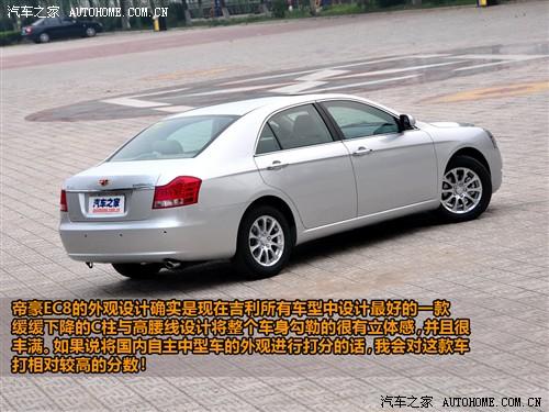剛才說完了我對這款車的第一印象,下面我再和你說說我的第二印象:漂亮。請不要認(rèn)為我是帝豪的車托,因此當(dāng)你見到帝豪EC8的時候也會對這款車的優(yōu)美的外形設(shè)計感到贊嘆。特別是從尾部以45°角看的時候更會讓你覺得它的線條很優(yōu)美。此外,帝豪EC8的C柱設(shè)計的特別厚實且平緩,這樣就與后備箱很好的融合在一起。