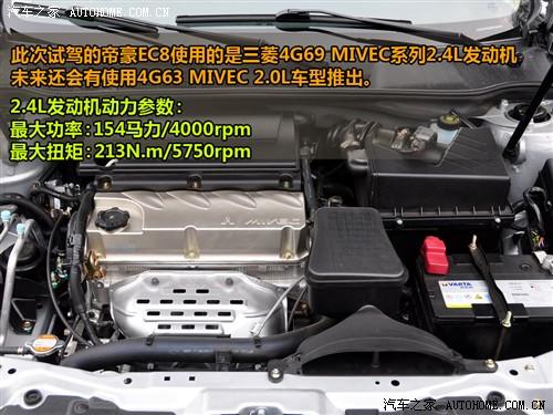 此次試駕的帝豪EC8車型全稱為EC825,采用的是三菱2.4L 4G69發(fā)動機,這臺發(fā)動機可是有歷史念頭了,國內很多廠家都在使用這臺發(fā)動機作為自己的動力單元。而帝豪EC8使用的這臺發(fā)動機則是原裝進口的4G69 MIVEC發(fā)動機,雖然從數據上看并么有什么亮點,但是發(fā)動機本身質量比較過硬,同時在油耗方面比較控制的相對較好。