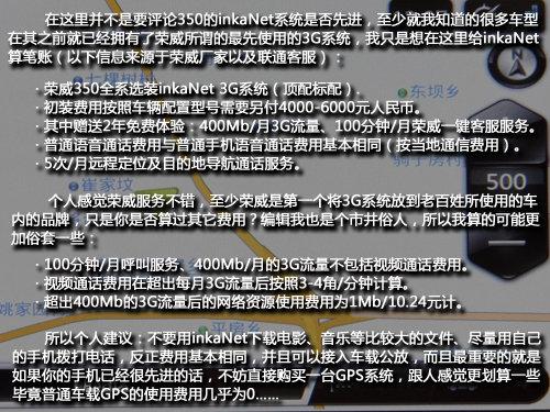 當然,服務費用相對貴這與榮威350的關系并不太大,這里只是建議在使用這套3G系統(tǒng)的時候注意流量與費用之間比例的關系,畢竟這收費最終受益人是聯(lián)通,而作為第一個將3G系統(tǒng)引入到真正民用型轎車而言,這套系統(tǒng)的實用性不言而喻,至少老百姓也可以隨時隨地享受品牌隨時隨地的便捷服務了。