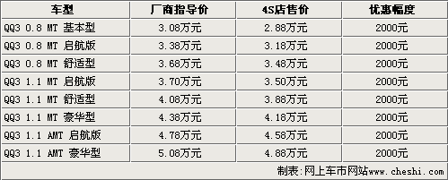 據(jù)奇瑞汽車4S店銷售人員介紹,奇瑞QQ3目前車型都比較齊全,包括新上市的啟航版車型都有現(xiàn)車銷售。而且目前奇瑞QQ3全系都可以優(yōu)惠2000元。另外銷售人員表示,如果到店詳談,還有可能贈送一些裝飾。