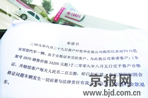 上午10時(shí)許,記者來(lái)到了位于豐臺(tái)區(qū)花鄉(xiāng)羊坊930號(hào)的金博藍(lán)汽車(chē)銷(xiāo)售服務(wù)公司,新車(chē)停車(chē)場(chǎng)里和展示廳內(nèi)只有4輛新車(chē)待售,偶爾還有人在看車(chē)試車(chē)。買(mǎi)了車(chē)卻拿不到合格證的車(chē)主陸續(xù)來(lái)到4S店,他們手中都拿著一份“承諾書(shū)”,其中承諾8月5日交付合格證,并賠償一定金額,如果違約則全款退車(chē)。