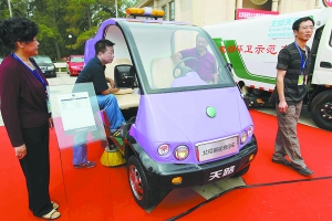一踏上北京展覽館門前的小廣場,參觀者便立刻被露天擺放在廣場上的各種新能源汽車吸引住了。看起來似乎和普通垃圾車沒什么兩樣的桶裝垃圾運(yùn)輸車與壓縮式垃圾車,實(shí)際上卻是靠電池來運(yùn)行的;北汽的新能源汽車最高時速已經(jīng)可以達(dá)到每小時160公里;小型電動汽車“竹風(fēng)”只需要30分鐘即可快速充電80%……
