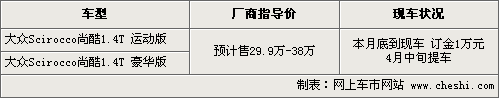 與六代高爾夫同平臺的大眾Scirocco尚酷轎跑車,自從在廣州車展上正式發(fā)布以后,引起眾多車友的極大關(guān)注,這款車采用了大眾IROC概念車的大量設(shè)計元素,是一款既彰顯時尚前衛(wèi)的運動氣質(zhì)又能滿足駕駛者日常功能需求的全能轎跑車。根據(jù)網(wǎng)上車市價格監(jiān)測系統(tǒng)顯示,目前尚酷展車已經(jīng)到店,本月底現(xiàn)車也將陸續(xù)到店,4S店開始接受消費者預(yù)訂,具體行情如下: