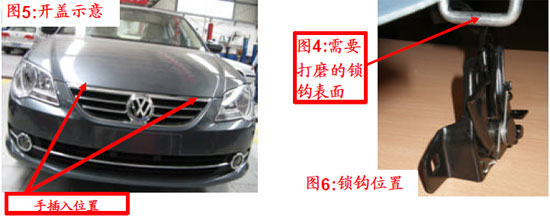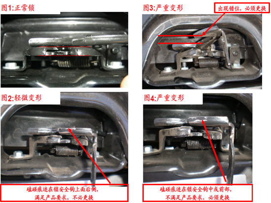 部分新寶來出現(xiàn)發(fā)動(dòng)機(jī)艙蓋開啟困難的現(xiàn)象,用操縱手柄開啟發(fā)動(dòng)機(jī)艙蓋,發(fā)動(dòng)機(jī)艙蓋沒有解鎖彈起(發(fā)動(dòng)機(jī)艙蓋不能正常開啟)。經(jīng)判定為發(fā)動(dòng)機(jī)艙蓋鎖的質(zhì)量問題或裝配質(zhì)量問題,可能為下鎖體變形或者鎖鉤與下鎖體不對正,進(jìn)而造成關(guān)閉開啟困難或假鎖。