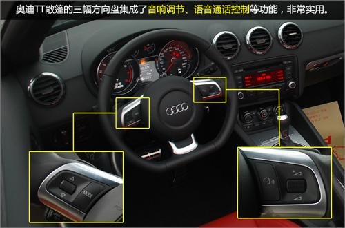 三輪輻運動方向盤包裹Nappa皮革,手感極佳。下部形狀扁平的設計與頂級超跑R8如出一轍。其實這種設計除了體現(xiàn)運動感外還有方便駕駛員進出的實用功能。方向盤上還集成了音響控制、語音通話控制等多項功能,非常方便。