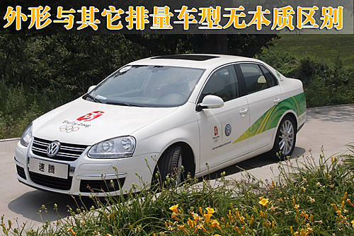 從外觀上來(lái)看1.4TSI速騰車型與目前市場(chǎng)上銷售的1.8T、1.6以及2.0車型基本一致,車輛的尺寸也沒有明顯的變化,而因?yàn)樵?jīng)是08奧運(yùn)綠色車隊(duì)的成員,因此該車的外觀貼有相應(yīng)的貼紙,更加凸顯了這款車型的與眾不同。