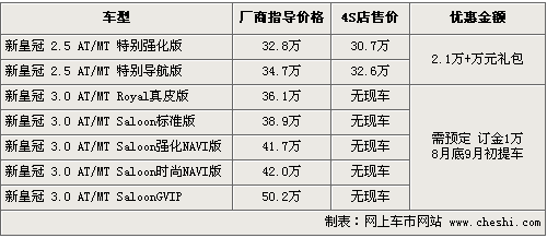 筆者從一汽豐田經(jīng)銷商處了解到,目前新皇冠的價格出現(xiàn)了較大的降幅,最高優(yōu)惠達到2.1萬元,同時在7月31日之前購車的客戶贈送萬元的禮包,包括了三種不同的禮包。目前皇冠2.5L兩款車型有黑色、白色現(xiàn)車供應(yīng),而3.0排量基本沒有現(xiàn)車,據(jù)銷售人員介紹,目前主要以2.5L銷售為主。如果訂車的話,需訂金1萬元,8月底9月初能夠提到現(xiàn)車。