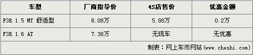 據(jù)比亞迪汽車北京地區(qū)4S店銷售人員介紹,目前北京在售的比亞迪F3R有兩款車型。1.5L手動(dòng)舒適版經(jīng)2000元的優(yōu)惠后售價(jià)從6.08萬降到了5.88萬元,1.6L自動(dòng)檔車型目前店內(nèi)沒有現(xiàn)車,所以不在此次優(yōu)惠隊(duì)列中。