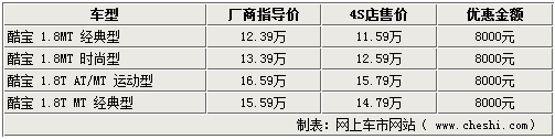酷寶系列車型,不僅外形時尚,動力也相當(dāng)充沛,不僅可與進(jìn)口跑車如蓮花競速相媲美,也帶動了自主跑車市場的競爭。近期網(wǎng)上車市網(wǎng)站了解到,隨著市場競爭的加劇,現(xiàn)在各家4S店均可給出全系8000元的現(xiàn)金優(yōu)惠,令此車型再次引起關(guān)注。具體詳情如下: