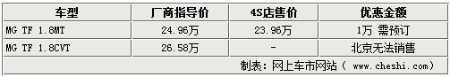 與比亞迪S8同為敞篷跑車設(shè)計(jì)的MG TF跑車在北京市場(chǎng)仍為訂單銷售狀態(tài)。網(wǎng)上車市網(wǎng)站由北京名爵經(jīng)銷商處了解到,現(xiàn)在購(gòu)買名爵MG TF跑車,雖然在價(jià)格上有萬(wàn)元的優(yōu)惠,但是各店均無(wú)現(xiàn)車,需要提前預(yù)訂,具體詳情如下: