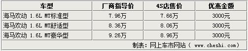 在市場中銷售有段時間的1.6L歡動新車,現(xiàn)已進入各個海馬經銷商展廳,現(xiàn)車充足顏色齊全。在售的三款新車均為手動版車型。除直接享受國家1.6L車型的購置稅優(yōu)惠政策外,并有現(xiàn)金3千元優(yōu)惠;銷售人員表示,現(xiàn)金優(yōu)惠也可換為等值的裝飾禮包,同樣超值,F(xiàn)金優(yōu)惠配合購置稅優(yōu)惠,則大大減輕了消費者的購車負擔。