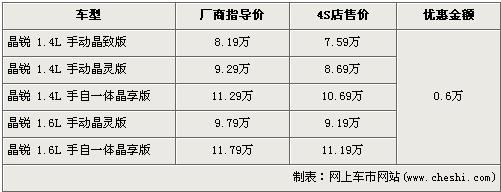 據(jù)4S店銷售人員介紹:目前晶銳全系優(yōu)惠6000元,最低僅售7.59萬。晶銳目前現(xiàn)車較為充足,顏色較齊全,只是個(gè)別車型無現(xiàn)車,顏色不齊全。如需要預(yù)訂車輛,最短需等2周時(shí)間,最長需等一個(gè)半月。