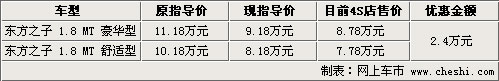 奇瑞東方之子在國內自主B級車中頗有盛名,暢銷六年以來,已經(jīng)逐漸成為國人的信任和驕傲。東方之子自從今年5月份官方降價2萬以來,北京市場反響積極。在此基礎之上,目前在北京市場購買東方之子現(xiàn)車,還可以得到4000元的現(xiàn)金優(yōu)惠。具體優(yōu)惠車型見下表:
