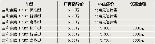據(jù)北京地區(qū)吉利4S店銷售人員表示,吉利金鷹目前只有1.5L手動車型有現(xiàn)車銷售,自動版車型則沒有現(xiàn)車,并且不接受預訂,具體到店時間目前還不得而知。不過,現(xiàn)在購買吉利金鷹手動版車型,全系都可以優(yōu)惠3000元。