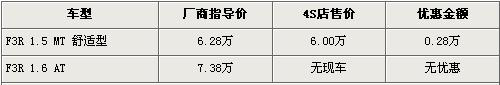 據(jù)比亞迪汽車北京地區(qū)4S店銷售人員介紹,目前北京在售的比亞迪F3R只有1.5L手動(dòng)舒適版車型,并且廠商指導(dǎo)價(jià)也從6.08萬(wàn)元回升到了6.28萬(wàn)元。目前購(gòu)買此車的消費(fèi)者可以得到2800元的優(yōu)惠,經(jīng)優(yōu)惠后售價(jià)降到了6萬(wàn)元。