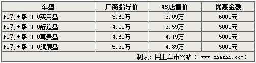 比亞迪F0作為該品牌旗下的首款微型轎車,售價(jià)3.69-5.39萬(wàn)元。在比亞迪F0愛(ài)國(guó)版上市初期,這款車就出現(xiàn)了最高1500元的優(yōu)惠幅度,隨著時(shí)間的推移,優(yōu)惠金額也在增加。網(wǎng)上車市網(wǎng)站由經(jīng)銷商處了解到,比亞迪F0在近日又出現(xiàn)了更多的優(yōu)惠幅度,最低配的車型最高可優(yōu)惠達(dá)6000元。