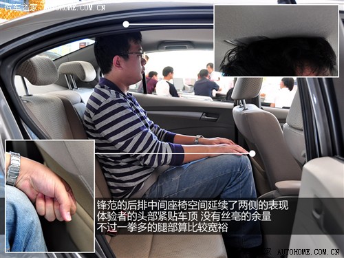 得益于較長的軸距,鋒范在內部縱向空間上的表現(xiàn)的確出色。但由于前排座椅設計的更為厚實一些,因此體驗者的腿部空間依然是和飛度上相同的兩拳。即便是換坐到中間座位,腿部依然有較出色的一拳多。此外鋒范的后排地板和飛度一樣屬于略有凸起但不影響舒適性的范疇。不過鋒范在內部垂直空間的表現(xiàn)上實難令人滿意,雖然車頂有為爭取更多頭部空間而設計的內凹造型,但實際效果不明顯?傊阡h范內,體驗者的頭部壓抑和不適感十分明顯。