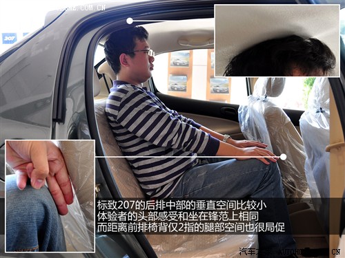 坐在標(biāo)致207后排兩邊的正常座位上,體驗(yàn)者頭部距離車(chē)頂僅兩指,這不太符合基本舒適性的要求,但也可以忍受。而腿部空間的表現(xiàn)可以被接受,頭枕的可調(diào)高度很符合安全性及舒適性的綜合標(biāo)準(zhǔn)。