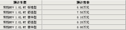 依照江淮汽車的定價(jià)規(guī)則,和悅MPV很有可能采用同悅的定價(jià)特點(diǎn),預(yù)計(jì)會(huì)推出1.8L、2.0L兩個(gè)排量共計(jì)五款車型。另外,和悅MPV的入門級(jí)車型很有可能會(huì)定下較低的價(jià)格,使該系列產(chǎn)品擁有一個(gè)低價(jià)的宣傳策略,往往這種入門級(jí)低配車型很難銷售,或者是根本無(wú)車銷售。從同悅的配置價(jià)格差異來(lái)看,和悅MPV的價(jià)格區(qū)間應(yīng)該會(huì)定在6.98-8.88萬(wàn)元左右。除了6.98萬(wàn)元的入門級(jí)車型,和悅MPV同排量的舒適型和豪華型價(jià)格相差6000元左右,而同配置不同排量的兩款車的價(jià)格差應(yīng)該在7000元左右。