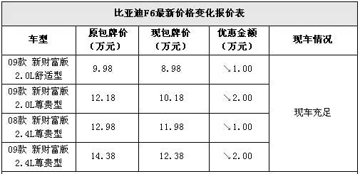 近日,編輯從深圳粵迪比亞迪4S店了解到,目前比亞迪F6現(xiàn)車比較充足,并且有1-2萬元的現(xiàn)金優(yōu)惠,該優(yōu)惠是在包牌價的基礎(chǔ)上實行,感興趣的朋友請致電咨詢。具體價格請見下表: